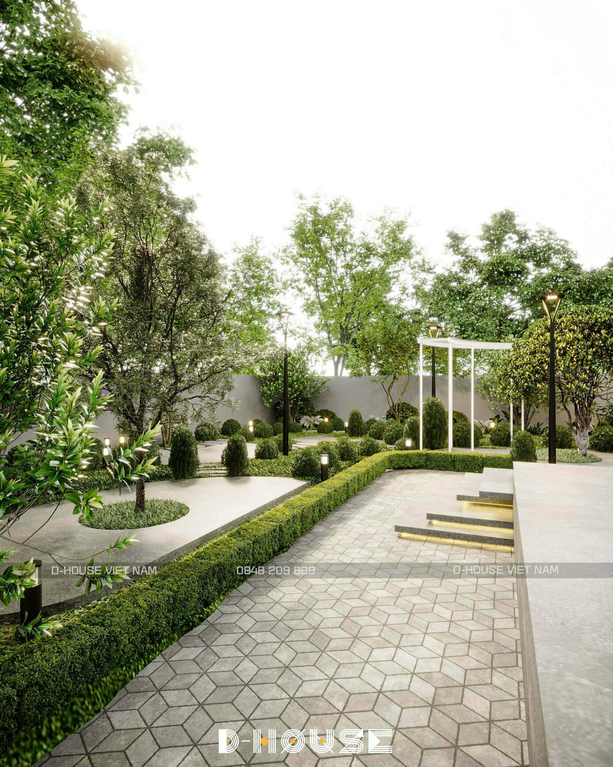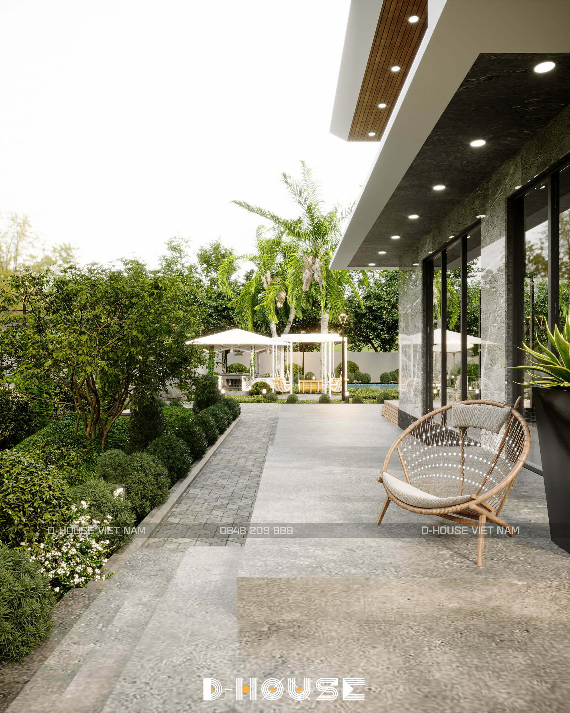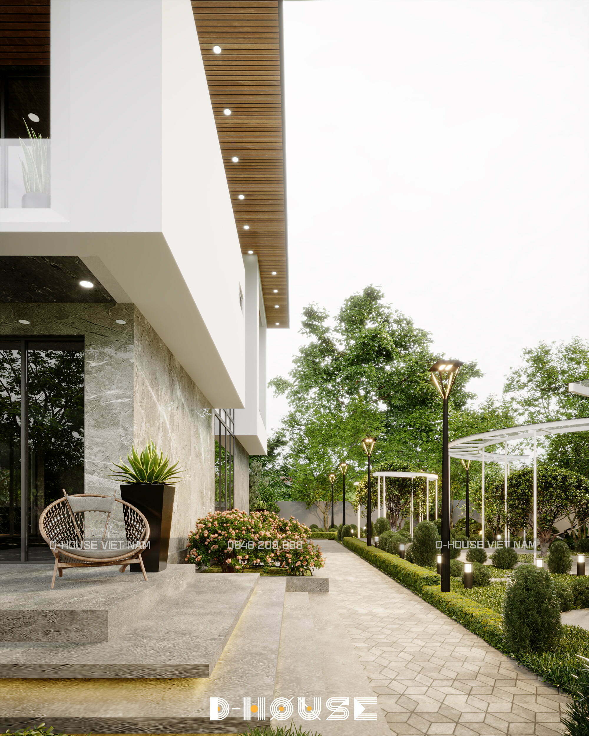 Sân vườn được thiết kế đồng bộ, tôn lên vẻ đẹp công trình.