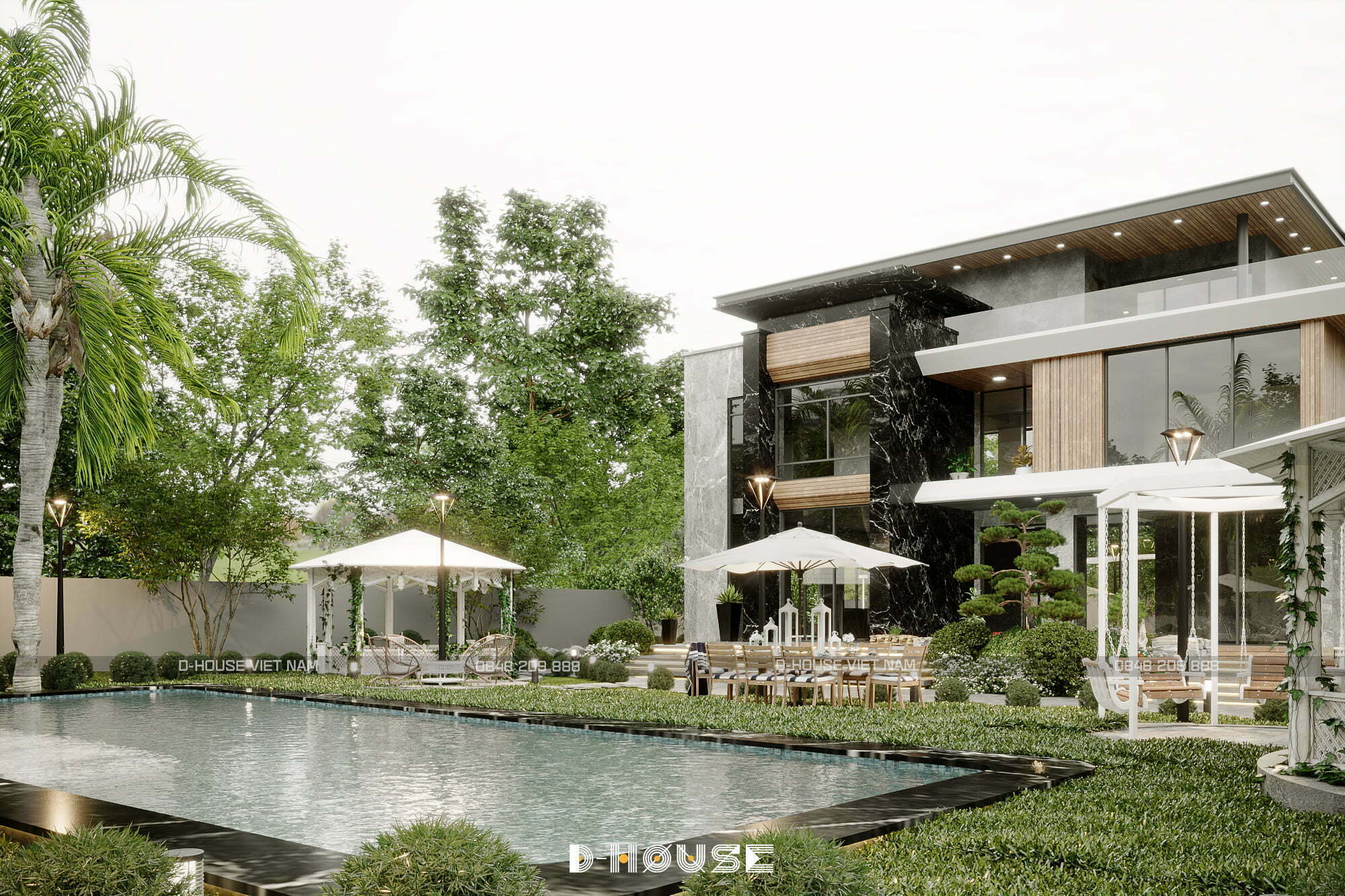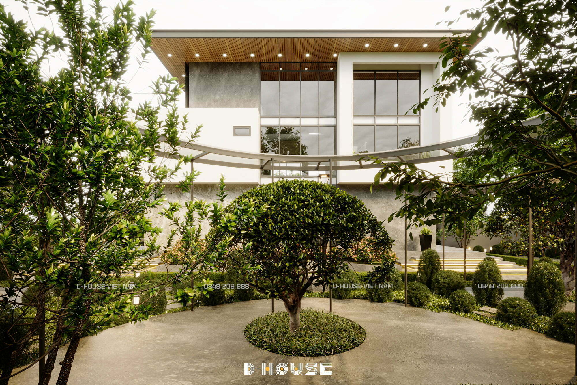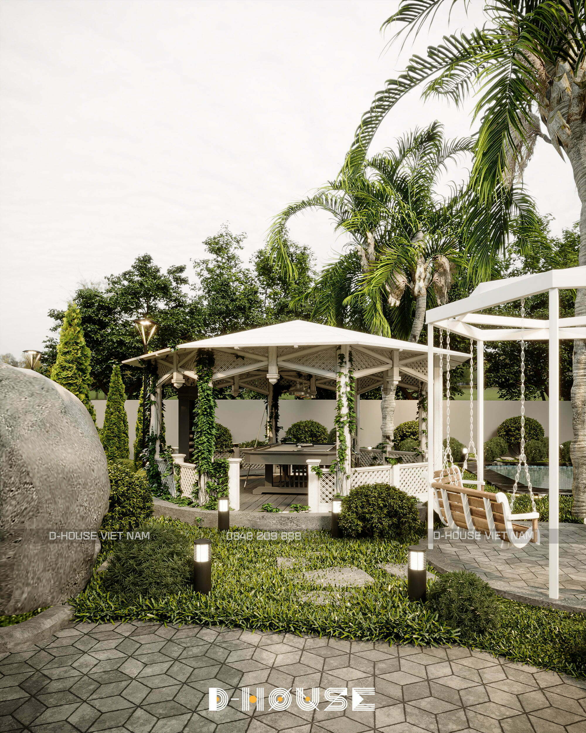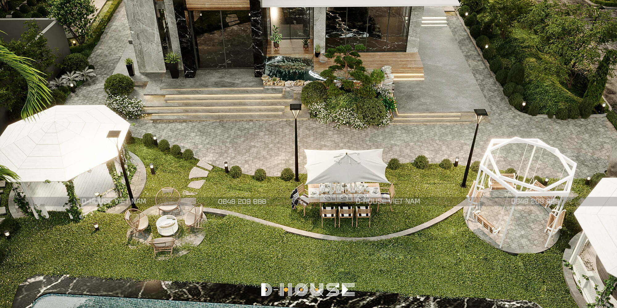 Sân vườn được thiết kế đồng bộ, tôn lên vẻ đẹp công trình.