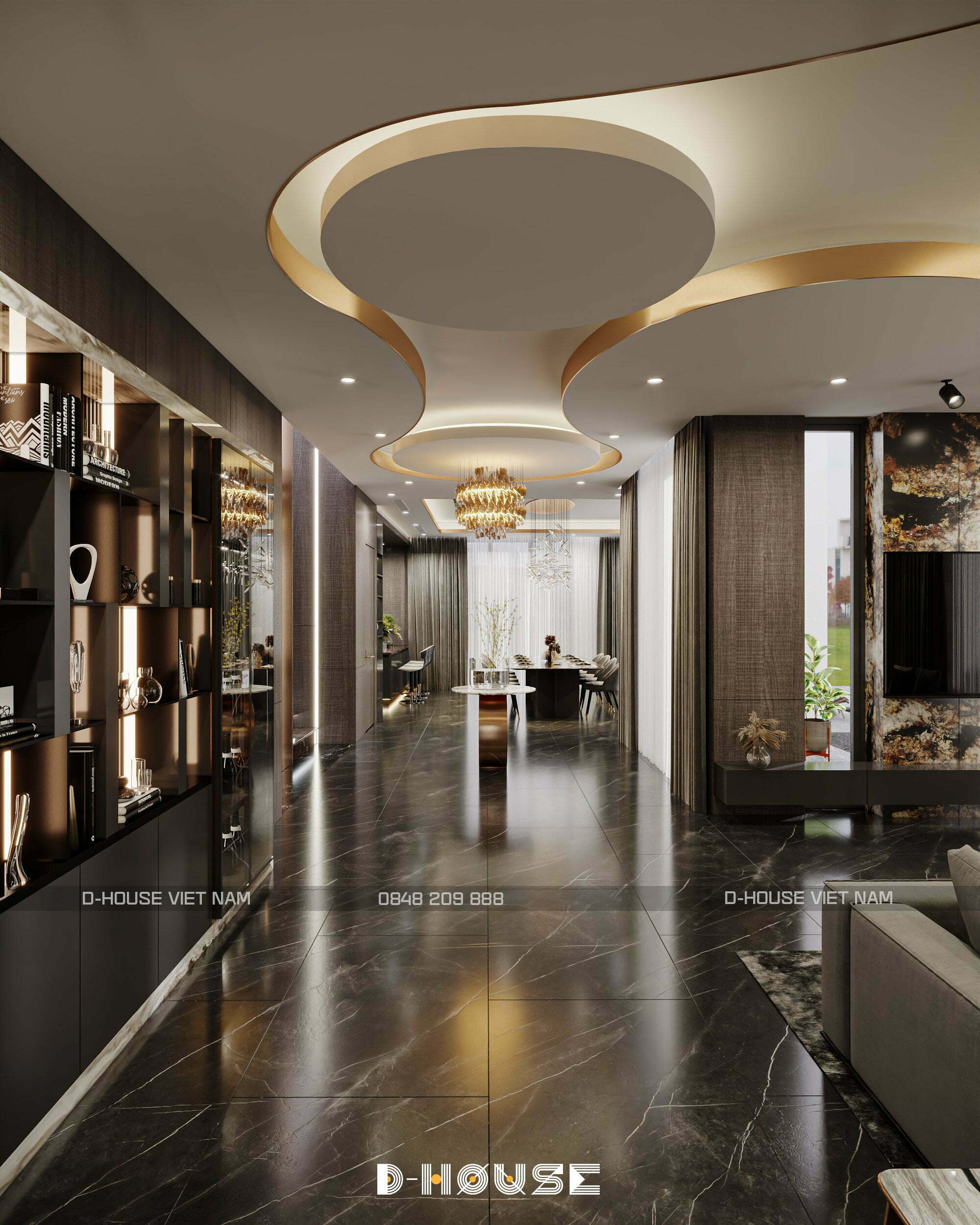 Trần nhà thiết kế vuốn cong, làm điểm nhấn ấn tượng khi khách bước vào.