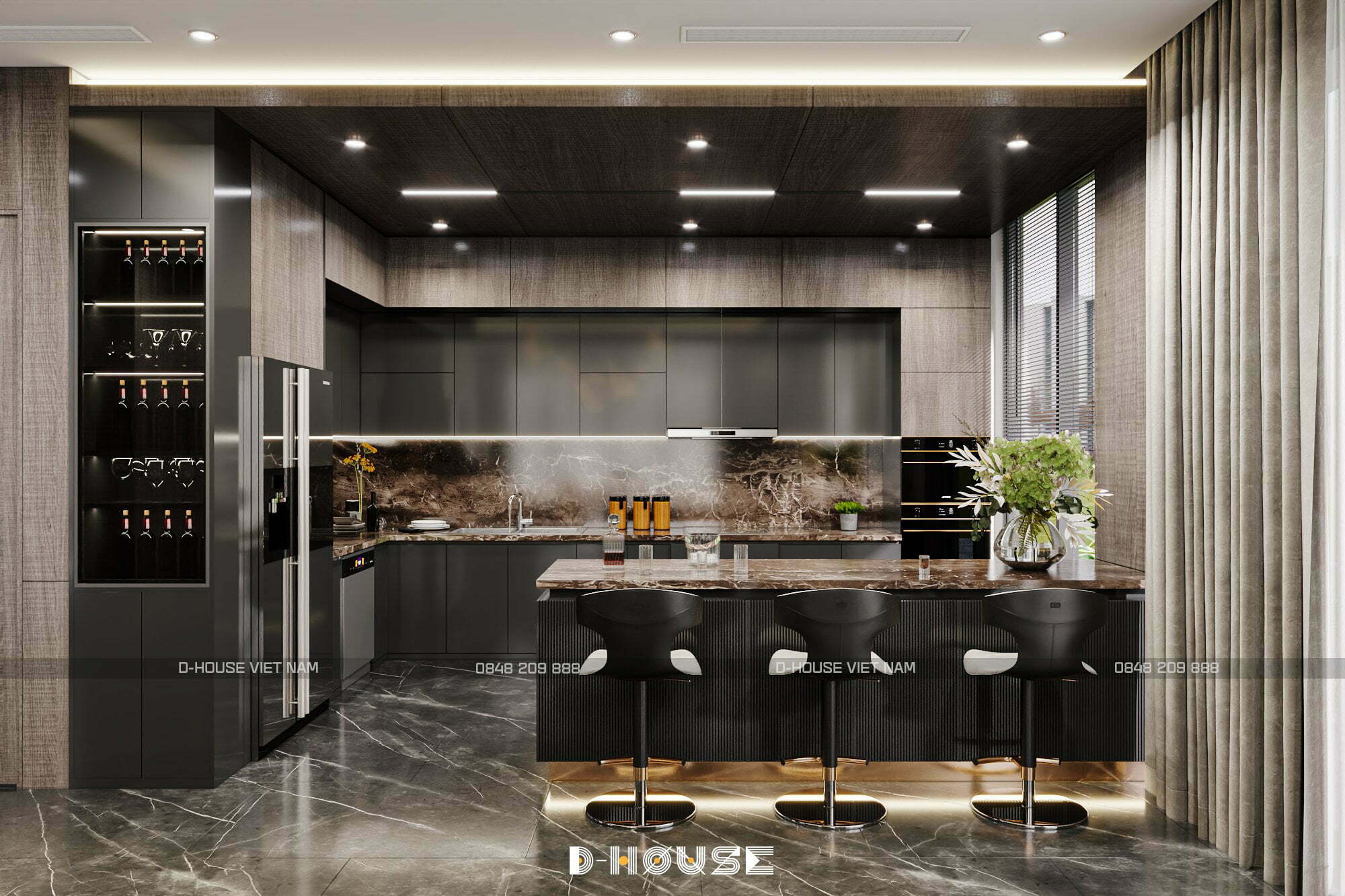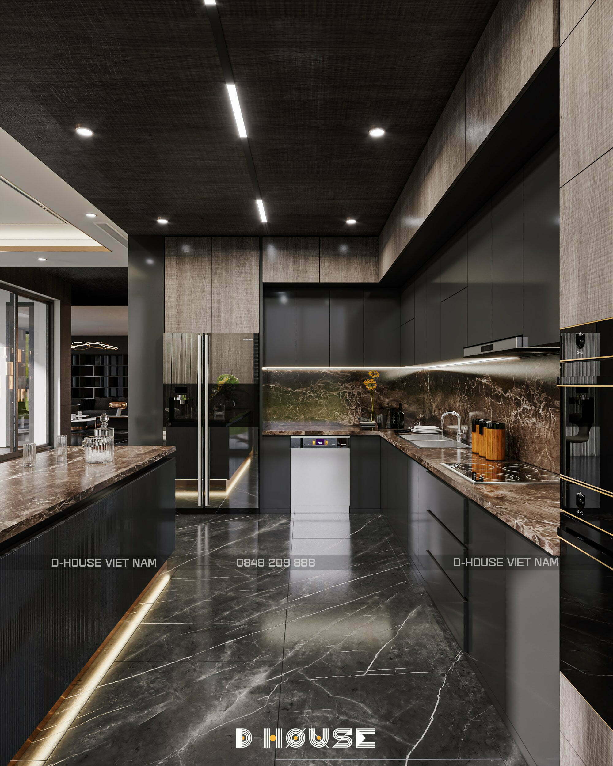 Bếp sử dụng đá và gỗ tối màu giúp giữ cho gian bếp được sạch sẽ.