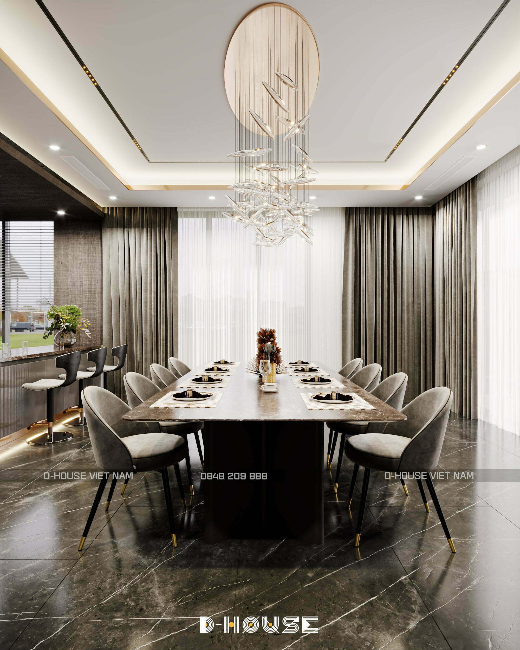 Bàn ăn rộng 8 ghế, với đèn thả.
