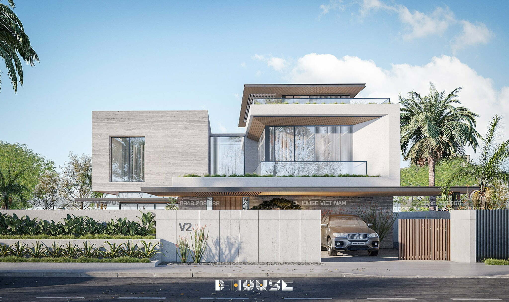 Cổng chính thiết kế cực kỳ ấn tượng với mái hiên gỗ. Các lam gỗ dọc tạo hiệu ứng bóng đổ lên mặt sàn